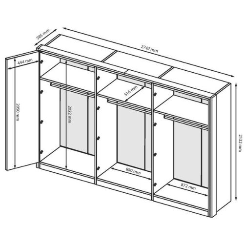 Szafa wyróżnia się solidnym wykonaniem oraz dużą pojemnością – jej wnętrze zostało podzielone na trzy szerokie moduły, które oferują wyjątkowo funkcjonalne rozwiązania do przechowywania.