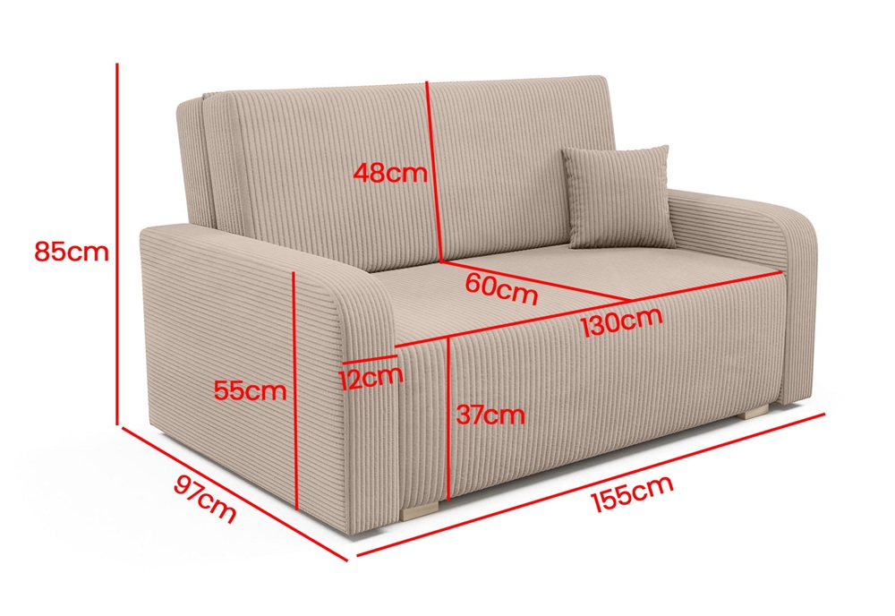 Model o wymiarach 155 × 97 × 85 cm oferuje przestronne miejsce do wypoczynku dziennego, a dzięki praktycznemu systemowi rozkładania typu amerykanka w prosty sposób zamienia się w wygodne łóżko o powierzchni 130 × 196 cm.