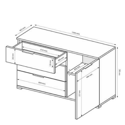 Mebel wyposażony jest w trzy pojemne szuflady i szafkę z półkami, które pomieszczą odzież, tekstylia domowe, dokumenty czy inne niezbędne przedmioty, pomagając w utrzymaniu porządku i organizacji przestrzeni.