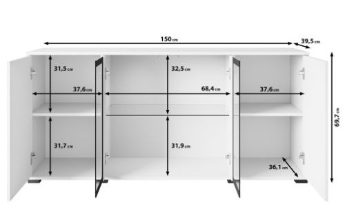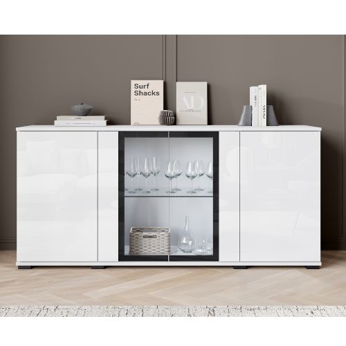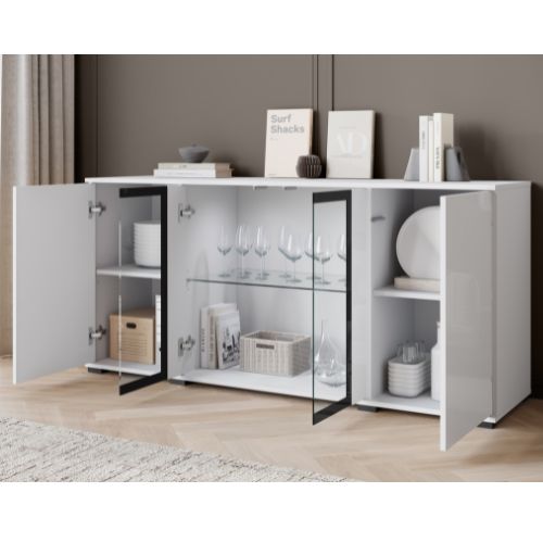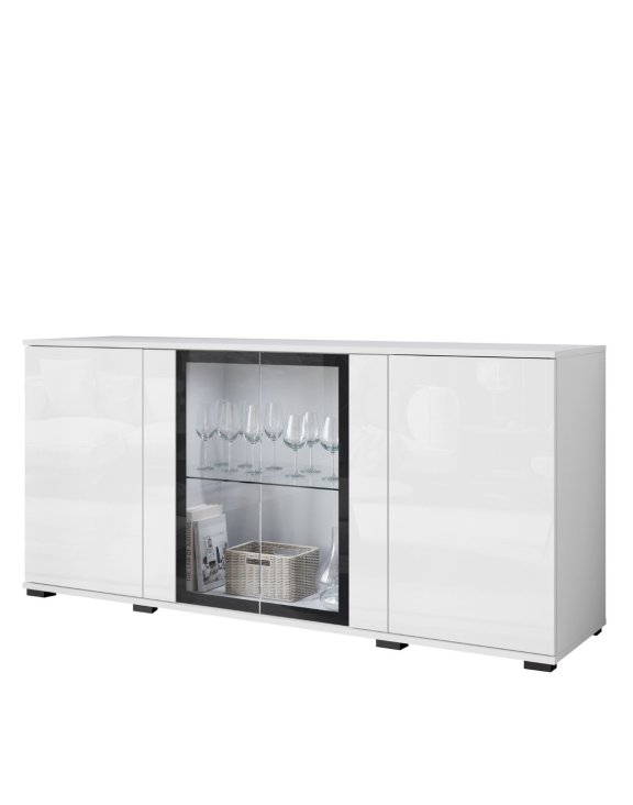 Komoda Caro to propozycja dla osób, które szukają nowoczesnego mebla o eleganckim, a jednocześnie ponadczasowym charakterze. Połączenie białego połysku z kontrastową czarną ramką przy szklanych frontach nadaje jej wyrazisty, ale nadal bardzo uniwersalny wygląd.
