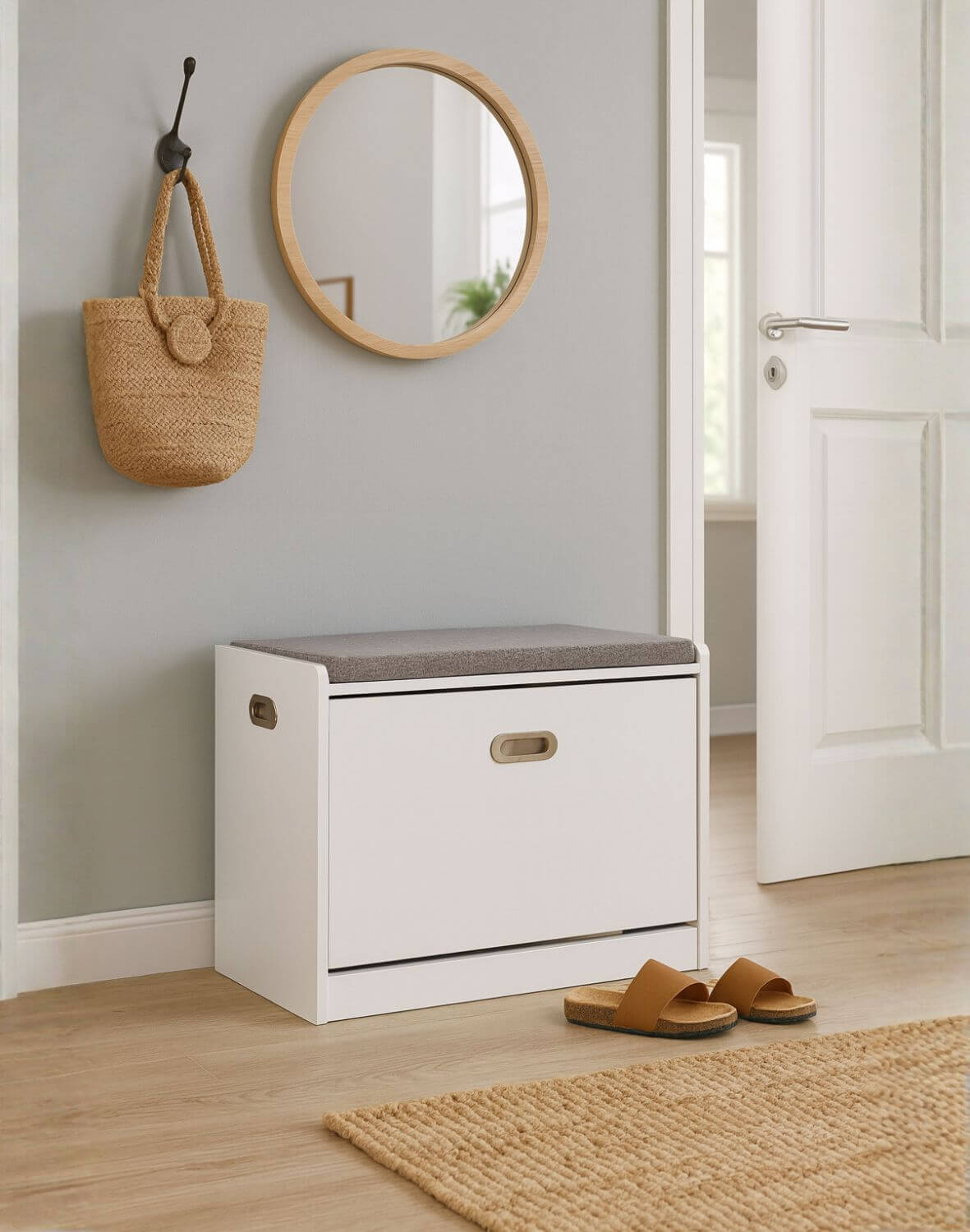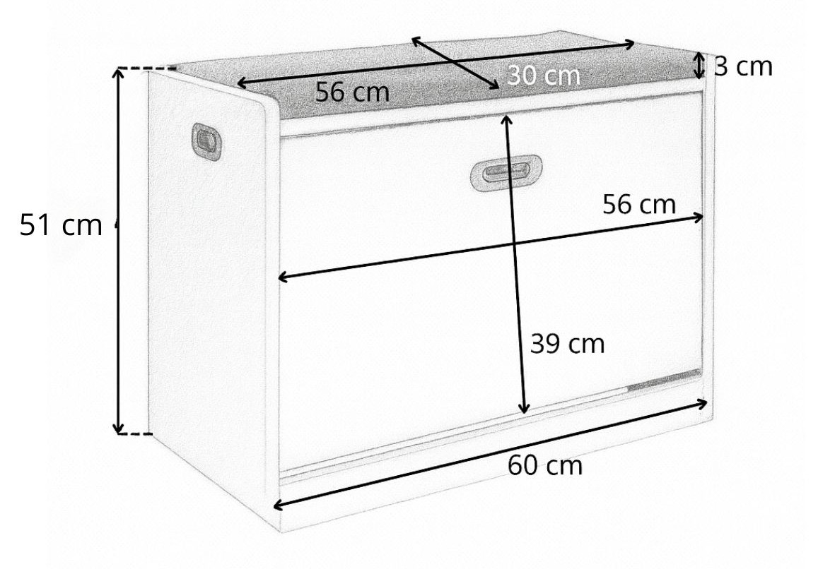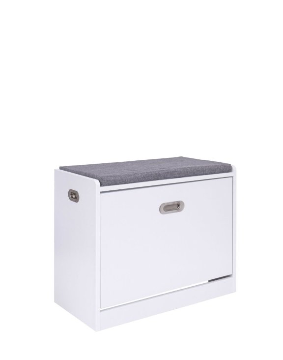 Na górze umieszczono szarą, miękką poduszkę, tworząc wygodne siedzisko ułatwiające zakładanie butów.