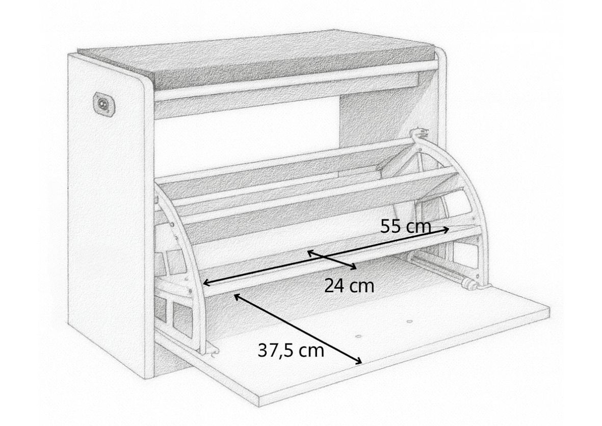 Wewnątrz szafki znajduje się praktyczny, uchylny system półek umożliwiający przechowywanie kilku par obuwia w sposób uporządkowany i łatwo dostępny.