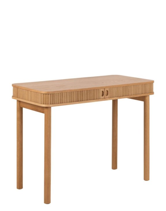 Charakterystycznym elementem tego biurka są dekoracyjne lamelowe fronty oraz praktyczne rozwiązania, takie jak przesuwne drzwi żaluzjowe, które skrywają wygodne miejsce do przechowywania niezbędnych rzeczy.