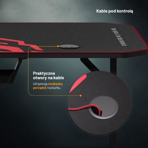 Wyraziste logo Diablo prezentuje się wyjątkowo charakterystycznie, odmieni więc spektakularnie Twoje stanowisko gamingowe. Dodatkowo biurko posiada otwory na przewody ze specjalnymi nakładkami, które bez problemu możesz założyć na powierzchnię maty.