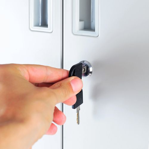 Drzwi szafy wyposażone są w solidny zamek na klucz, co gwarantuje bezpieczeństwo przechowywanych dokumentów i przedmiotów. To szczególnie ważne w przypadku akt firmowych, dokumentacji wewnętrznej czy materiałów wymagających ograniczonego dostępu.