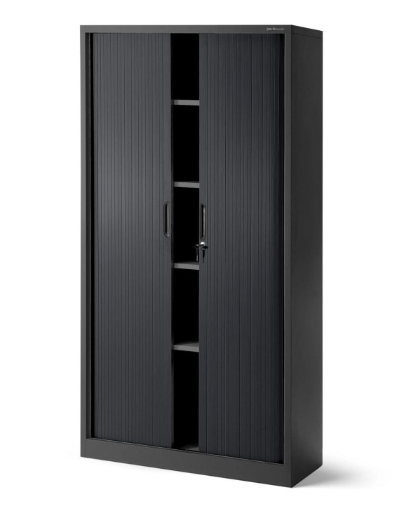 Biurowa szafa metalowa DAMIAN w kolorze antracytowym, z przesuwnymi drzwiami w formie rolety spełnia najważniejsze zalety produktów w swojej kategorii.