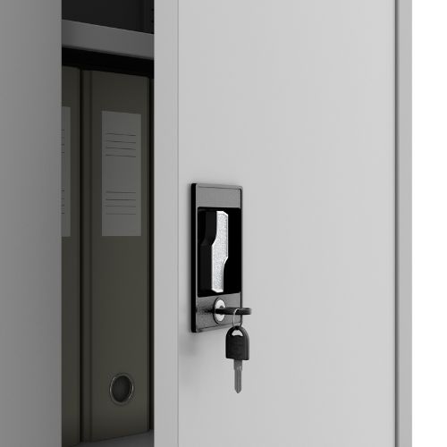 Biurowa szafa metalowa JAN marki Jan Nowak w szarym kolorze jest niezastąpionym meblem w przestrzeni biurowej.