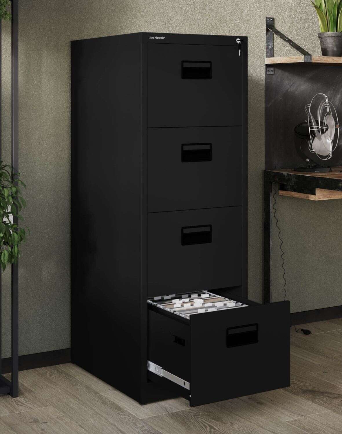 Czarna szafa kartotekowa z wysuwanymi szufladami to funkcjonalne rozwiązanie do przechowywania dokumentów i akt. Zamykana na klucz, zapewnia bezpieczeństwo przechowywanych kartotek, a solidna metalowa konstrukcja sprawdza się w biurach, archiwach i urzędach.