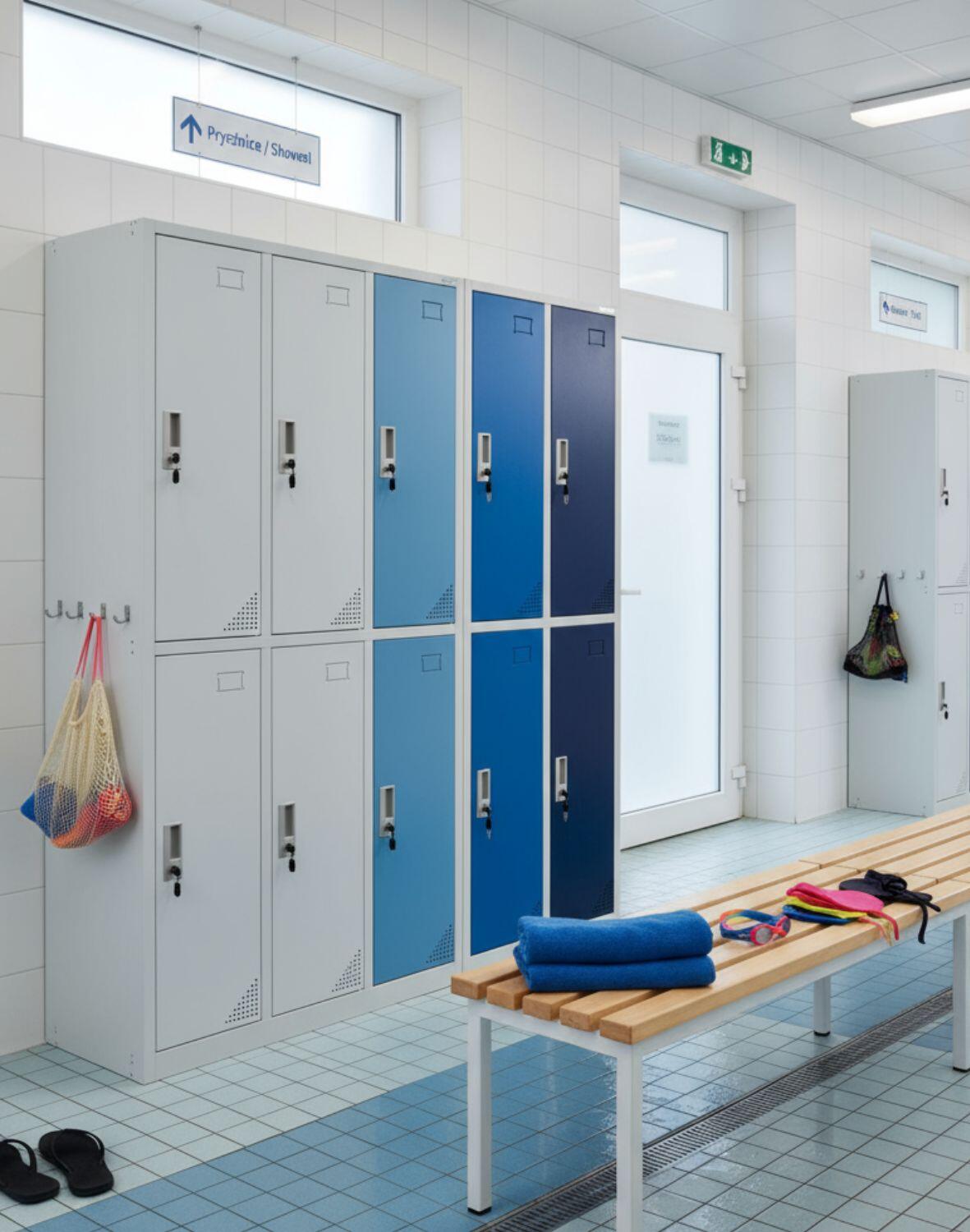 Metalowa szafa skrytkowa w szatni basenowej, wyposażona w zamykane na kluczyk skrytki do przechowywania rzeczy osobistych użytkowników.