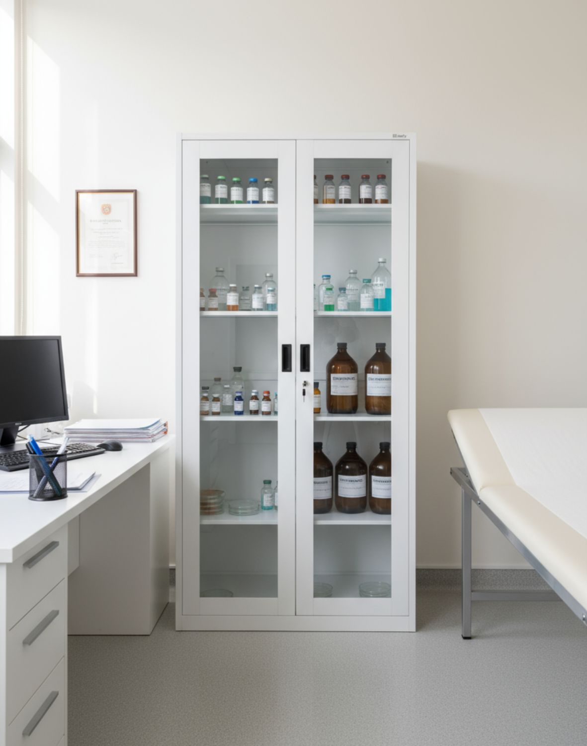 Witryna lekarska, metalowa szafa z przeszklonymi drzwiami, przeznaczona do przechowywania leków i materiałów medycznych. Ustawiona w gabinecie, zapewnia dobrą widoczność zawartości oraz łatwy dostęp do potrzebnych preparatów.