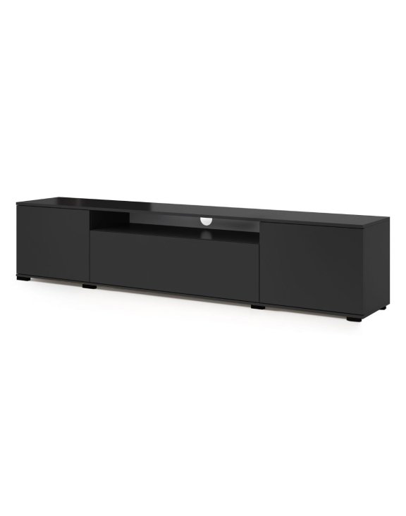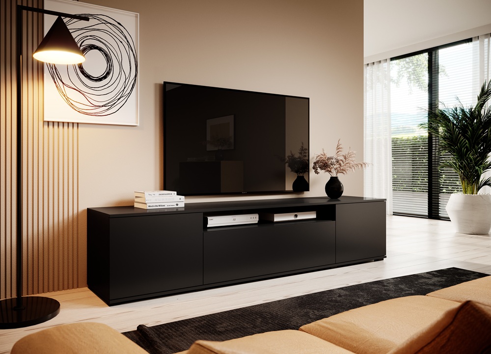 Czarna szafka RTV Logan 200 na niskich plastikowych nóżkach to minimalistyczna i elegancka propozycja do nowoczesnych salonów.