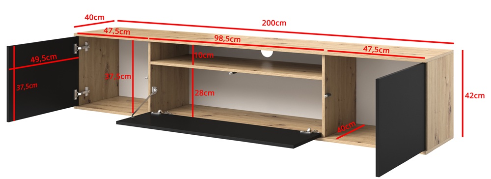 Jednolita czarna kolorystyka korpusu i frontów podkreśla nowoczesny charakter mebla, a brak uchwytów dzięki systemowi Push to open zapewnia czystą, geometryczną formę. Szafka doskonale sprawdzi się jako baza pod telewizor, sprzęt audio-wideo oraz akcesoria, jednocześnie zachowując estetyczny wygląd strefy multimedialnej.