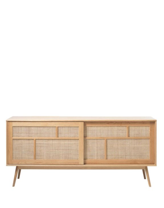 Jego design łączy naturalny dąb z dekoracyjnymi elementami z rattanu, co nadaje mu lekkości i przytulnego wyglądu.