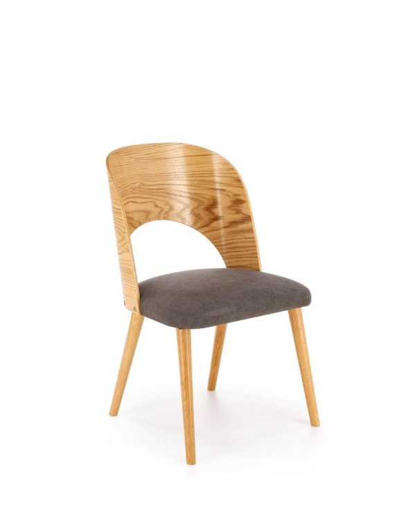 Tapicerka w kolorze popielatym, umieszczona tylko na siedzisku, dodaje krzesłu elegancji i subtelności.