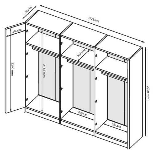 W środku znajdują się aż trzy szerokie przestrzenie wiszące, idealne na długie sukienki, płaszcze, koszule czy marynarki. Każda z nich jest wyposażona w solidny drążek oraz szeroką półkę górną na sezonowe rzeczy, torby czy pościel.