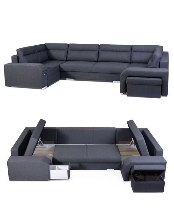 Wyposażony w 4 schowki: dwa duże w otomanach, jeden mniejszy ukryty w pufie oraz najmniejszy w szufladzie umieszczonej w podłokietniku, co zapewnia mnóstwo miejsca na przechowywanie.