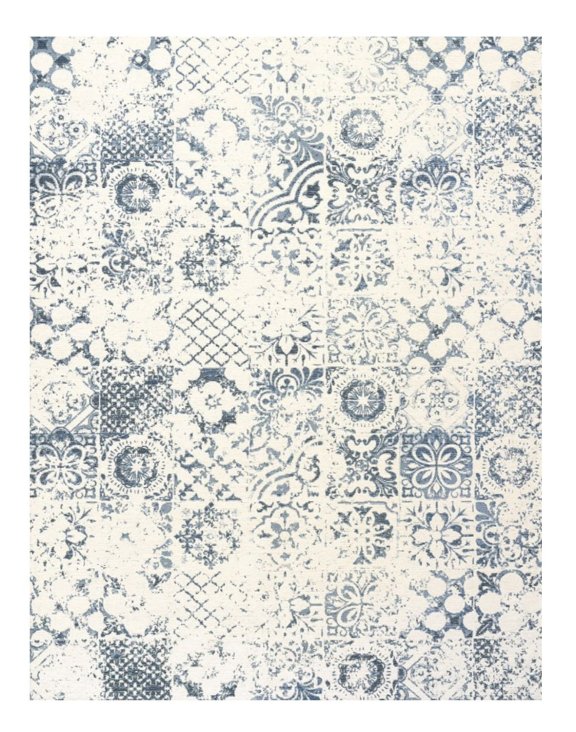 Dywan nada niepowtarzalnego charakteru sypialni bądź salonowi, dzięki użytemu motywowi, który przypomina kafle na postarzałym tle.