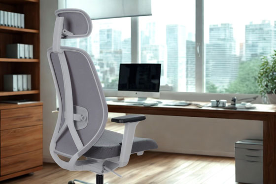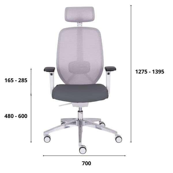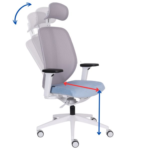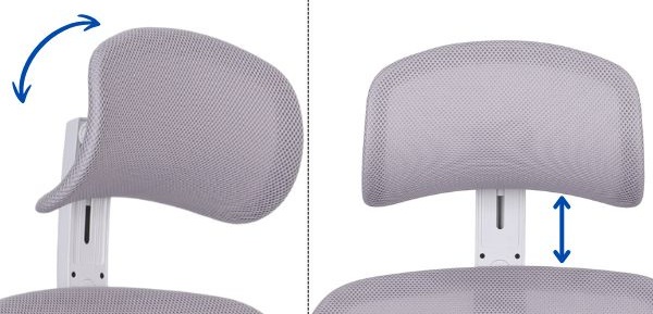Zagłówek tapicerowany jest siatką, regulowany w zakresie wysokości i kąta, co zapewnia dodatkowe wsparcie dla szyi i głowy.