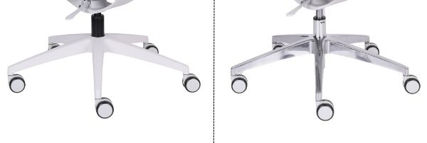 Podstawa jezdna dostępna w dwóch wersjach – z chromowanego aluminium lub z nylonu szara. Wyposażona w miękkie kółka o średnicy 60 mm, które są delikatne dla podłóg.
