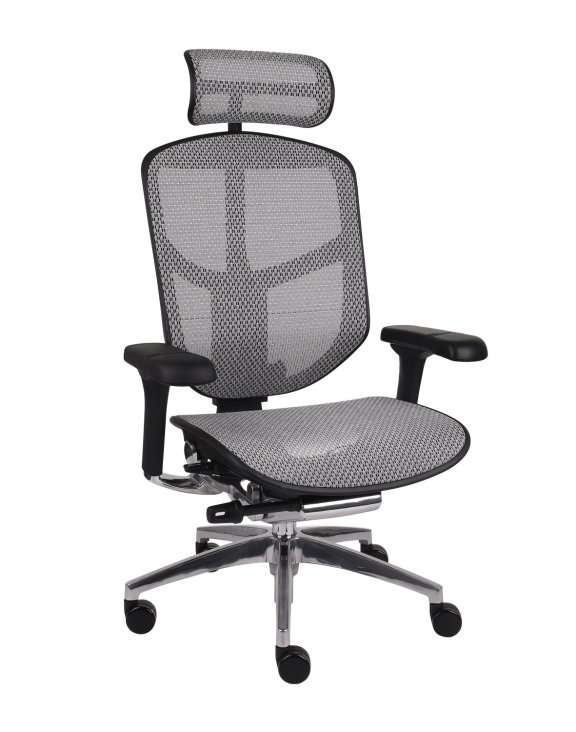 Zagłówek, oparcie oraz siedzisko tapicerowane są innowacyjną siatką w kolorze szarym.