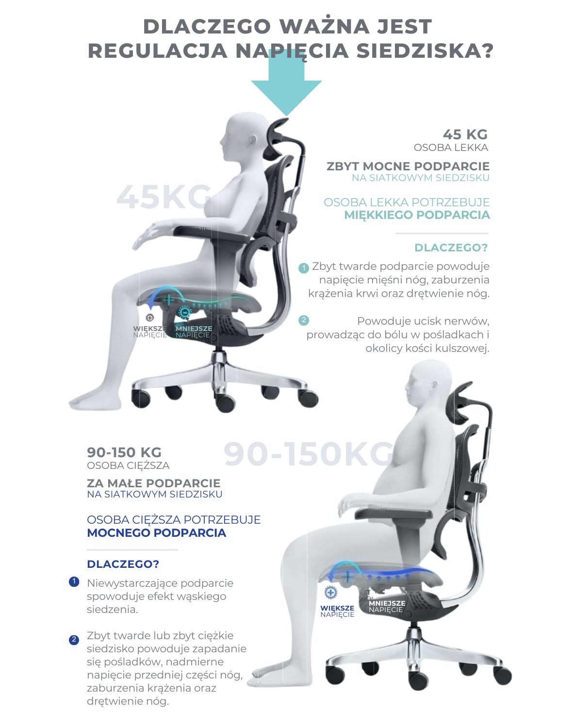 Nowa wersja fotela Egrohuman 2 Elite ST posiada regulację napięcia siatki siedziska, której dokonujemy oddzielnym pokrętłem.