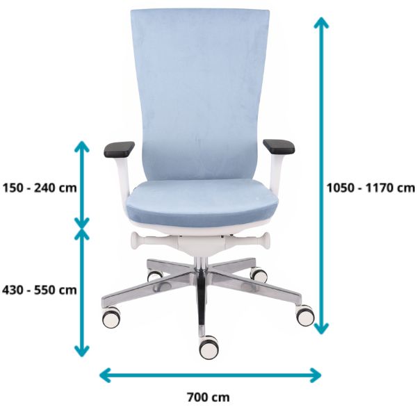 Podstawa krzesła do wyboru: czarna lub z polerowanego aluminium, wyposażona jest w kółka o średnicy 60 mm, które są bezpieczne dla parkietów i paneli. Dobrze sprawdzą się także na dywanach.