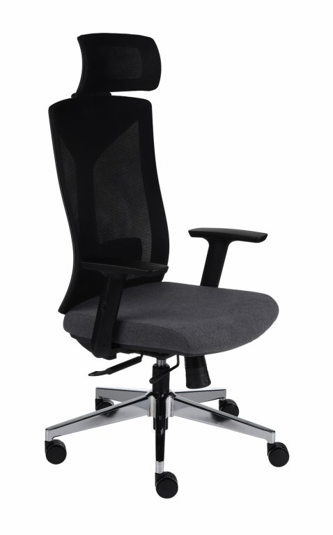 Oparcie oraz zagłówek tapicerowane są trwałą siatką w kolorze czarnym. Świetnie dopasowuje się do pleców Użytkownika, oddycha co jest szczególnie ważne w miesiącach letnich,