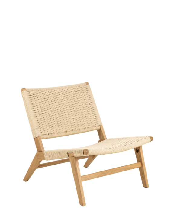 Jego lakierowana dębowa rama tworzy harmonijną całość z siedziskiem i oparciem wykonanym z plecionego papierowego sznurka, nadając mu naturalny, subtelny charakter.