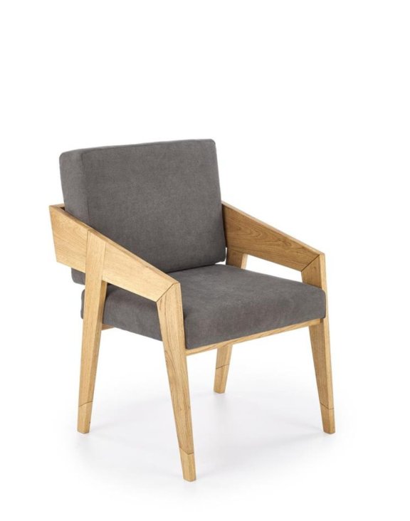 Tapicerka w kolorze ciemny popiel dodaje fotelowi subtelności i elegancji. Ten odcień doskonale komponuje się z drewnem dębowym, tworząc harmonijną całość, która pasuje zarówno do nowoczesnych, jak i klasycznych wnętrz.
