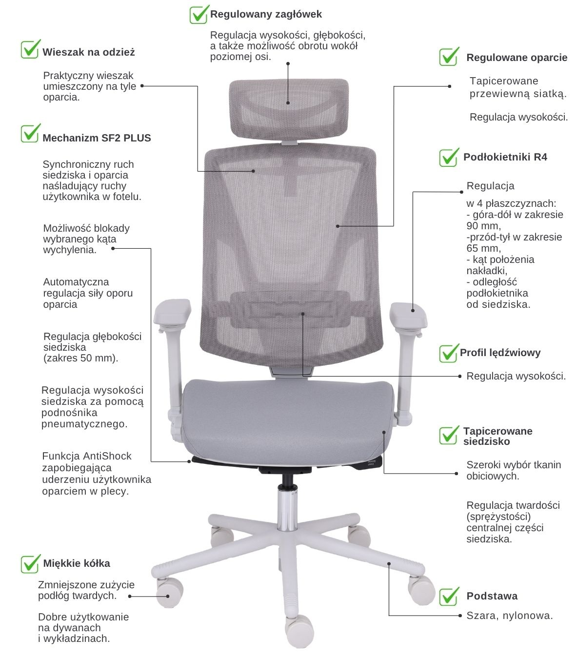 Fotel został wyposażony też w regulację odległości podłokietników od siedziska, a to pozwala jeszcze lepiej dostosować ich położenie do wzrostu Użytkownika.