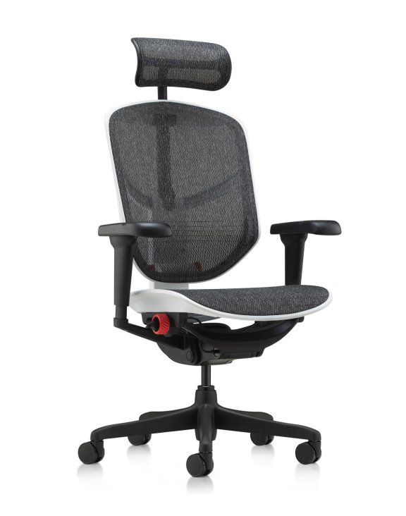 Zagłówek, oparcie oraz siedzisko tapicerowane są innowacyjną siatką w kolorze czarnym z dodatkiem białej nitki.