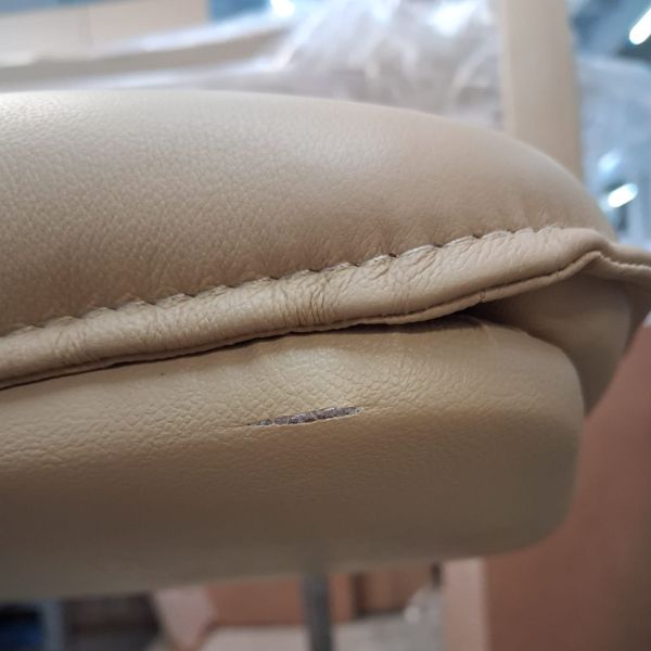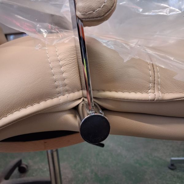 Fotel posiada uszkodzenia w tapicerce, brak chromowanych elementów, rysy na siłowniku oraz ślady montażu. Poniżej zdjęcia.