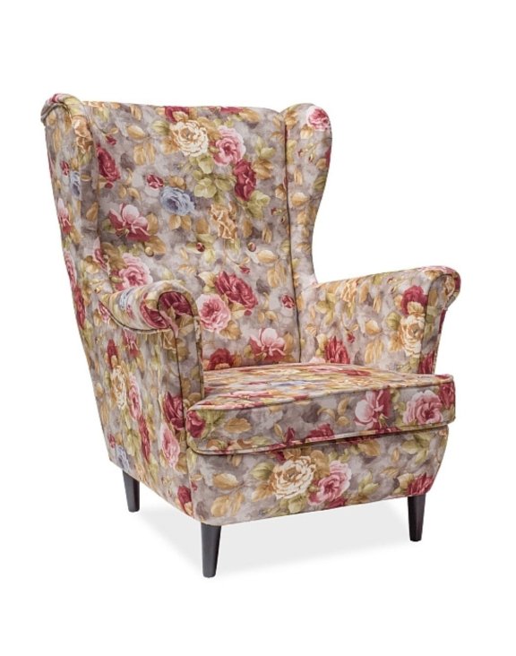 Wyróżnia się klasyczną sylwetką typu „uszak” z wysokim oparciem, szerokimi podłokietnikami oraz solidnymi drewnianymi nogami.