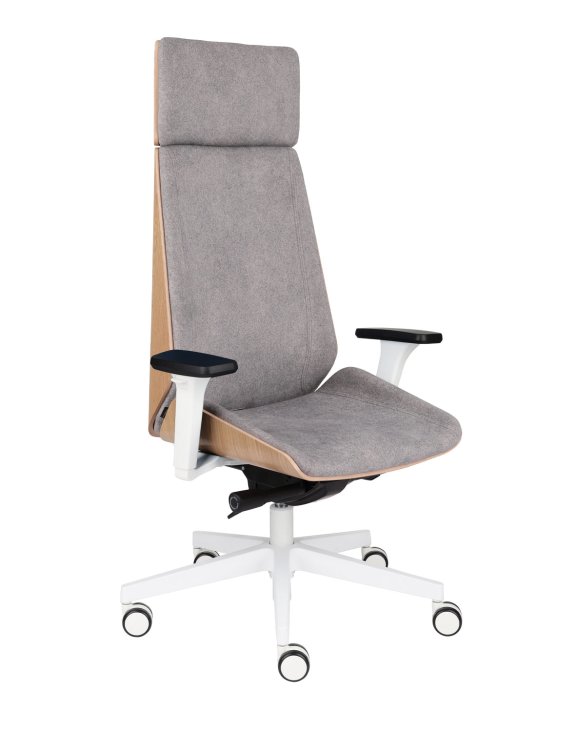 Nowa odsłona fotela Moon Wood HD White - Fornir dębowy marki Grospol, z białymi elementami konstrukcyjnymi, wyposażona w komfortowy zagłówek.