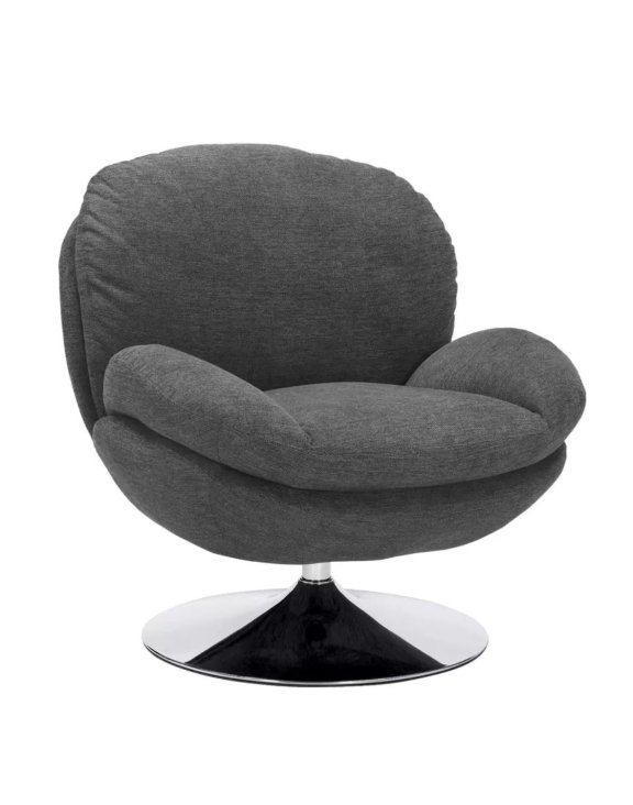 Tapicerowany niezwykle modną i przyjemną w dotyku tkaniną w kolorze ciemnym szarym, osadzony na solidnej, chromowanej podstawie w kształcie kielicha, oferuje nie tylko wyjątkowy komfort, ale także stabilność i trwałość.