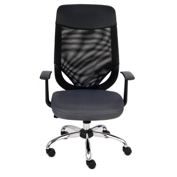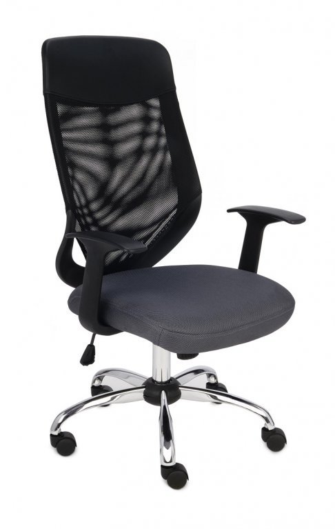 Oparcie tapicerowane jest siatką, zaś w górnej części ekoskórą w kolorze czarnym.