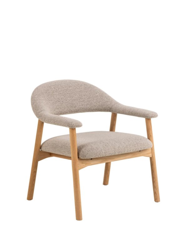 Siedzisko oraz oparcie pokryte są beżową tkaniną o strukturze bouclé, która wyróżnia się miękką, przyjemną w dotyku.