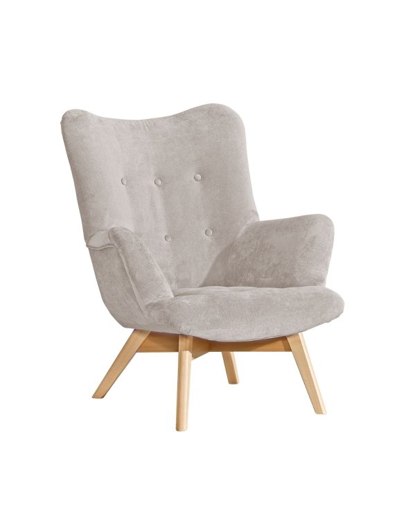 Bryła fotela postawiona jest na smukłych, drewnianych nóżkach, które dodają fotelowi lekkości.
