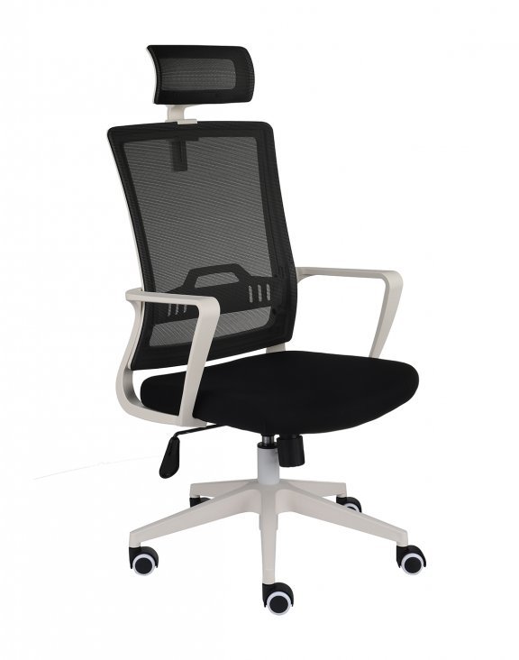 Siedzisko jest tapicerowane czarną tkaniną, natomiast oparcie i zagłówek siatką czarną.