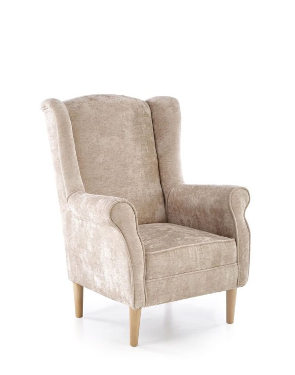 Tapicerka wykonana z przyjemnej w dotyku tkaniny Markos 3 w ciepłym beżowym odcieniu nadaje fotelowi subtelnej elegancji i sprawia, że mebel wnosi do wnętrza przytulny charakter.