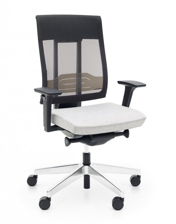 Siedzisko jest tapicerowane szarą tkaniną Next NX10, zaś oparcie tapicerowane jest czarną siatką String SR-15.