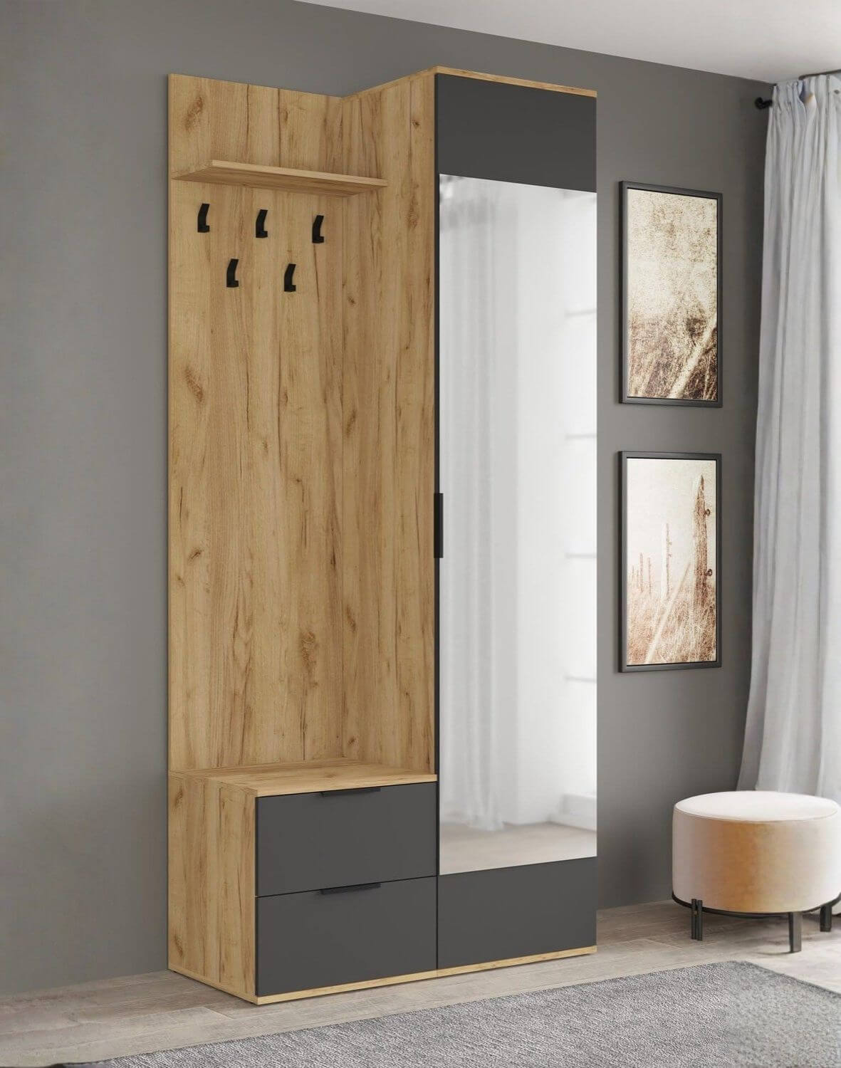Wykonany z laminowanej płyty meblowej w kolorze dąb złoty/antracyt, z dużym lustrem, tworzy stylową strefę wejściową do domu lub mieszkania, która pomaga podtrzymać organizację i porządek codziennych akcesoriów.