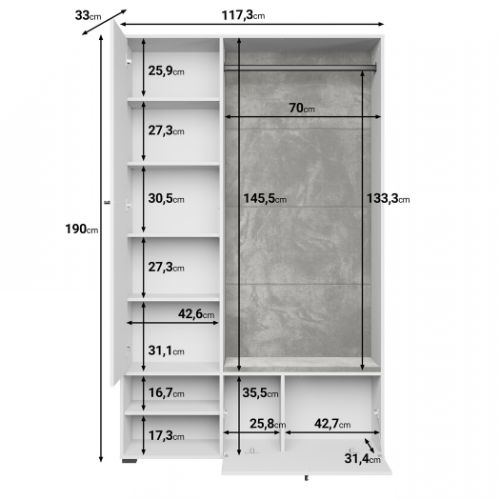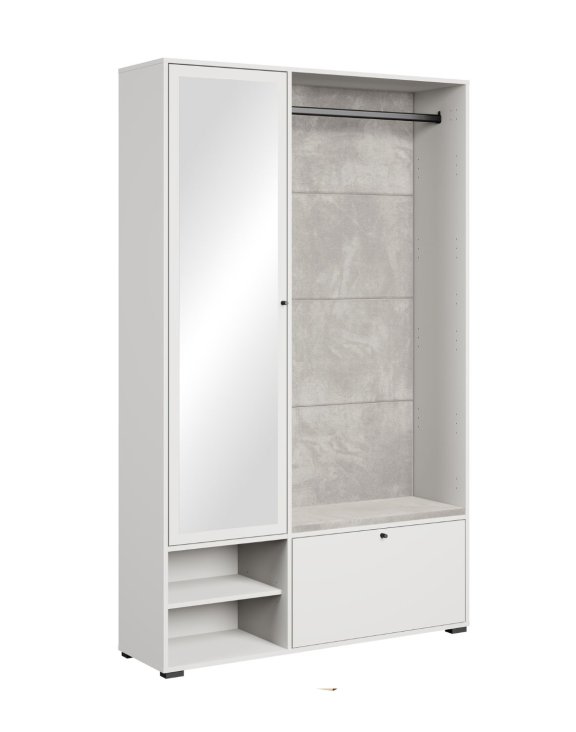 Garderoba Dino II została wyposażona w drążek na wieszaki, zamkniętą szafę z półkami, dolną szafkę z uchylnymi drzwiami i otwarte półki.
