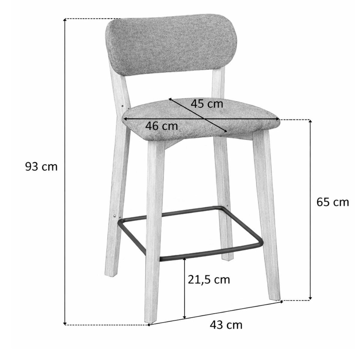 Wymiary: wysokość 93 cm., szerokość 46 cm., głębokość 45 cm., wysokość od ziemi do siedziska 65 cm., wysokość od ziemi do podnóżka 21,5 cm.
