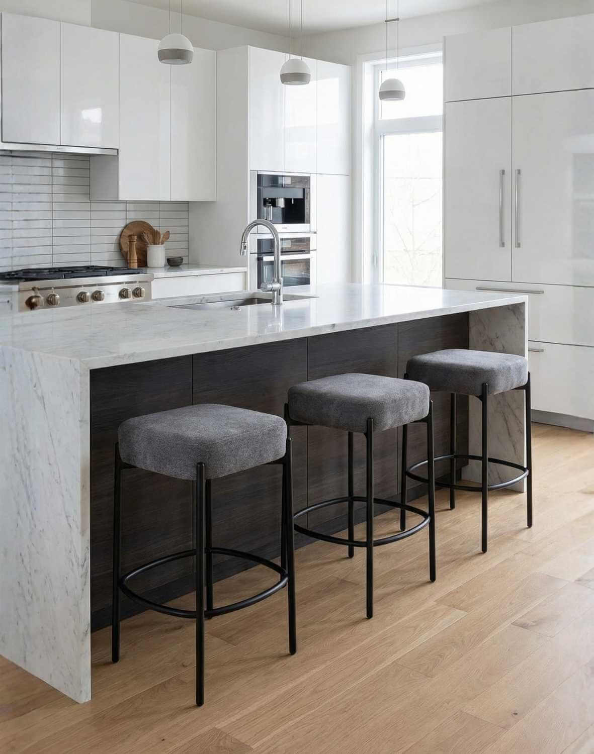 Grube, miękkie siedzisko zapewnia wygodę, co sprawia, że mebel ten idealnie sprawdza się podczas dłuższego siedzenia, na przykład przy wyspie kuchennej czy barze.