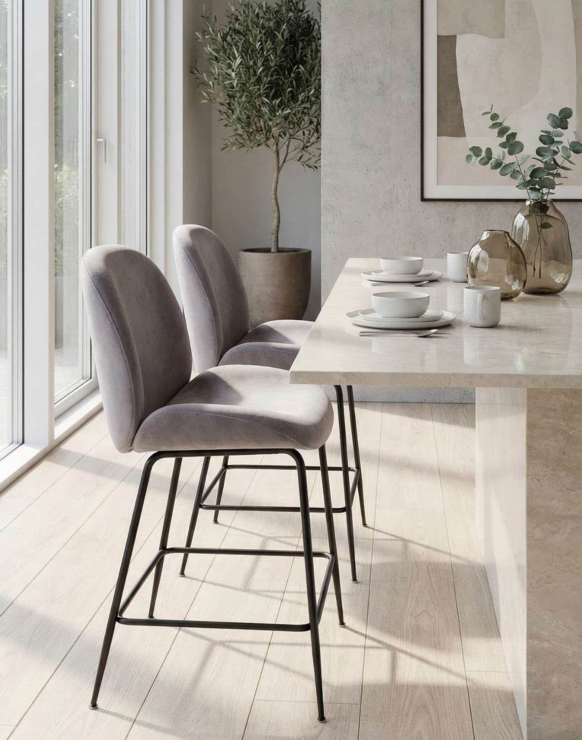 Elegancki hoker Dori Black marki Avida Design w kolorze szarym z zaoblonym oparciem i siedziskiem to doskonały element uzupełniający do kuchni, jadalni z wysoką ladą lub baru.