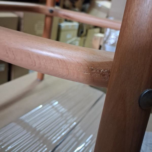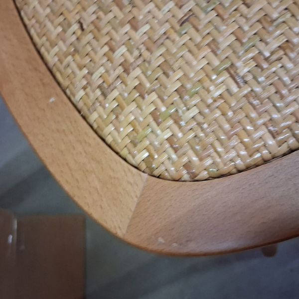 Hoker posiada odpryski w kilku miejscach, ratan jest uszkodzony. Poniżej zdjęcia.