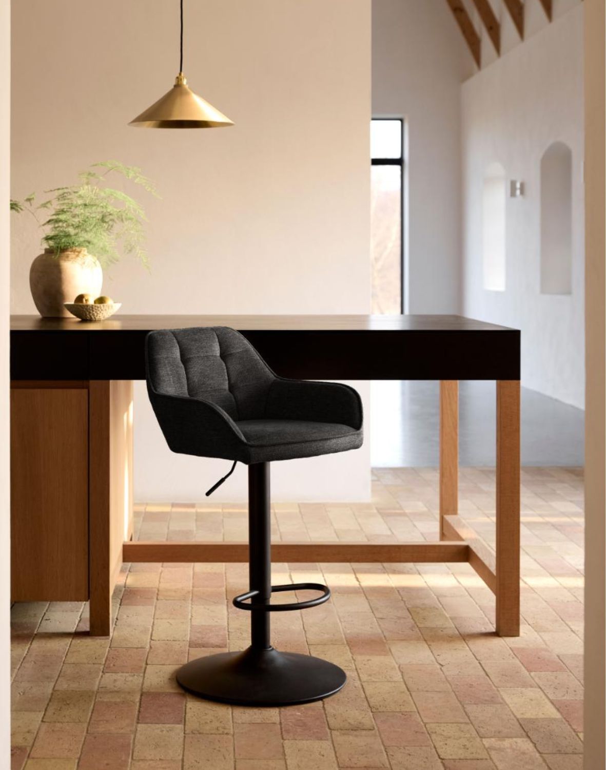Smukła, metalowa podstawa (regulowana) zapewnia stabilność i nowoczesny charakter, a całość doskonale odnajdzie się w kuchni, przy wyspie, w jadalni, barze czy przestrzeniach komercyjnych.