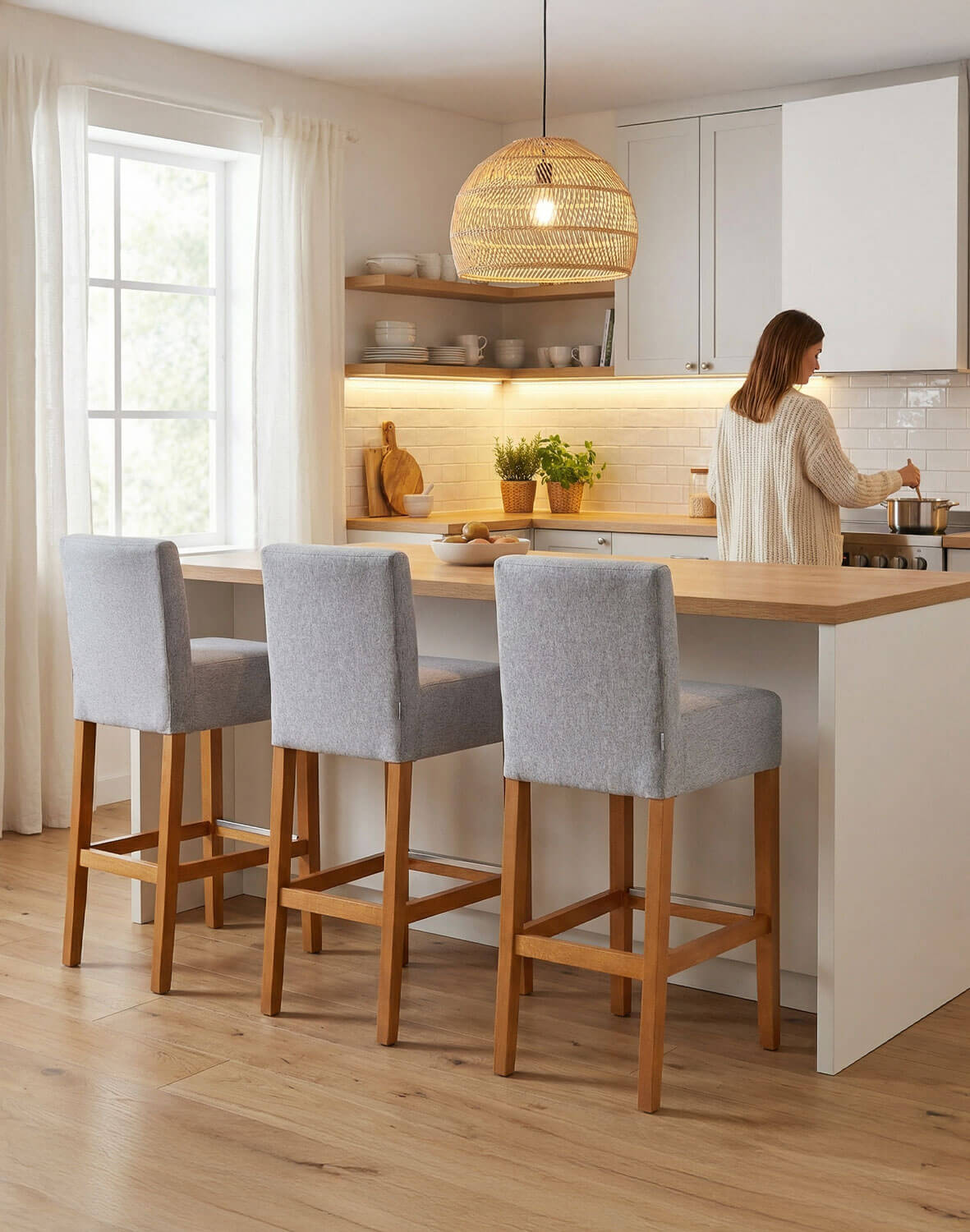 Nogi hokerów zabezpieczone są stopką filcową, aby chronić podłogę przed zarysowaniem.