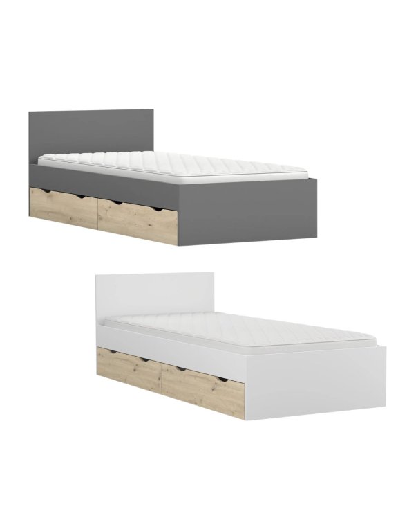 Model o powierzchni spania 90x200 cm wyposażony jest w dwie głębokie szuflady, które umożliwiają praktyczne przechowywanie pościeli, ubrań sezonowych czy zabawek.